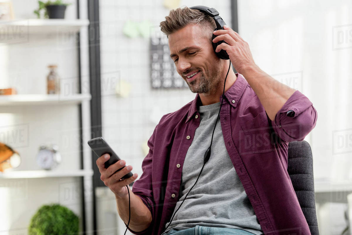 Happy man listening music while sitting on chair at home office Stock Music Listening Chair Consider your comfort, style, sound preferences, and space limitations when making your decision. for those operating on even tighter budgets, ikea’s new äleby swivel chair promises to furnish us with a more. what is the best type of chair for listening? choosing the best chair for listening to music is a personal journey. no matter which. Music Listening Chair.