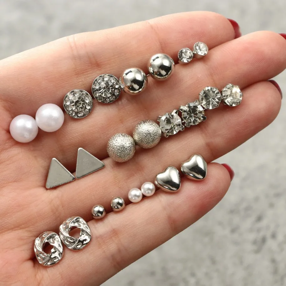 12paris/set multi Shaped Pearls Crystals Metals Mini Stud Earring Packs