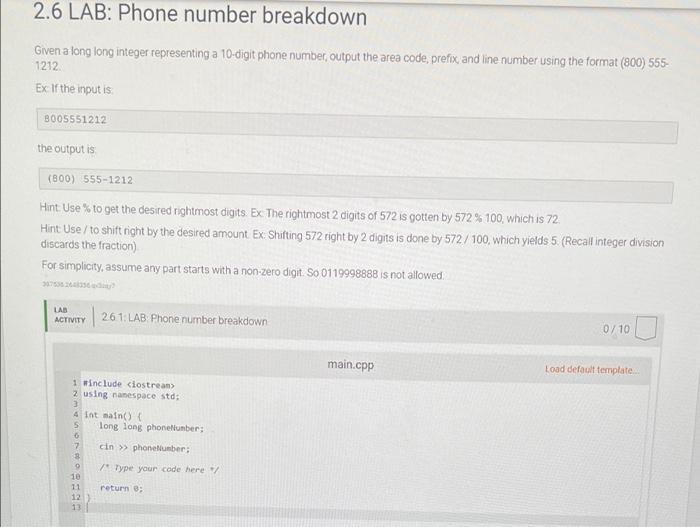 Solved 2.6 LAB Phone number breakdown Given a long long