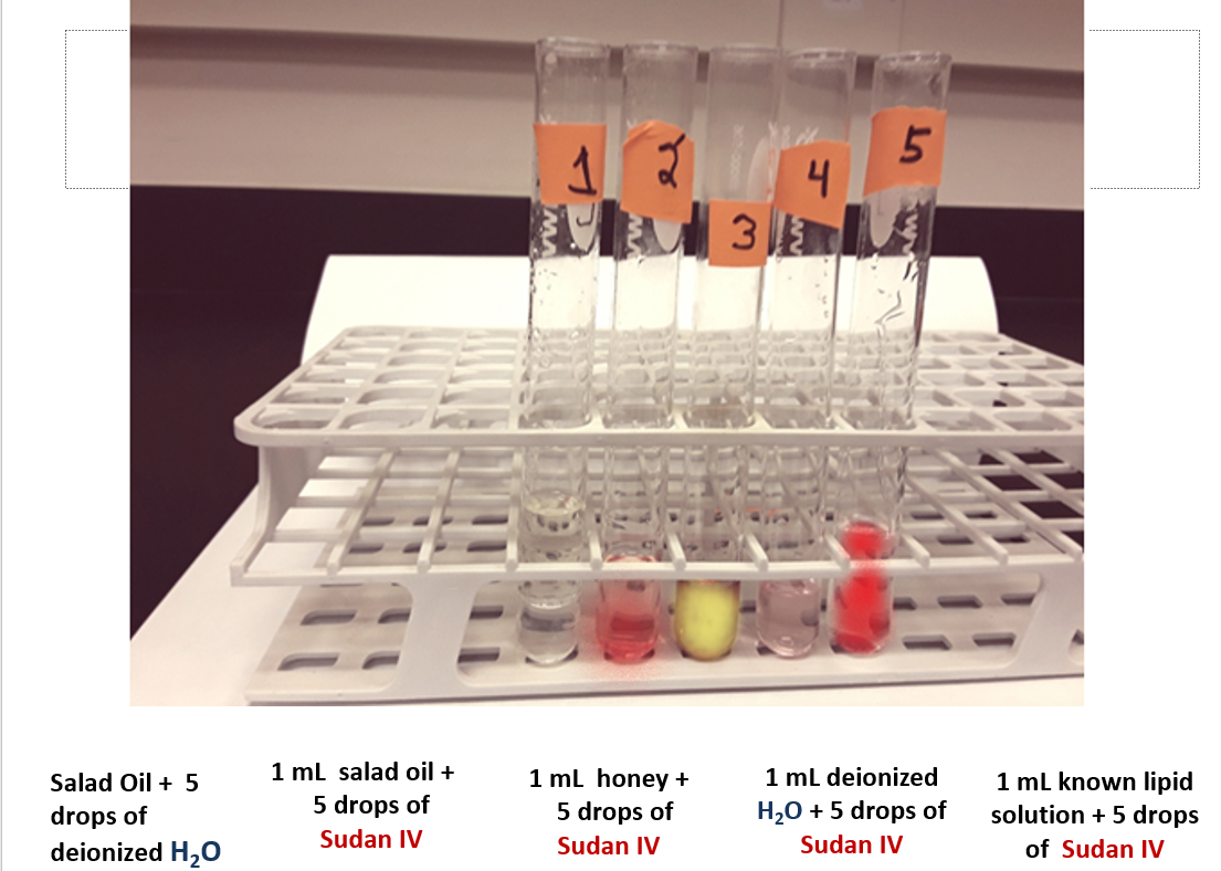 Solved Sudan IV Test for Lipid 1. Obtain five test tubes and What Color Indicates A Positive Result For Sudan Iv Test When a solution containing these. A positive result of the sudan iv test shows two layers and red color on the top layer,. Sudan iv contains a fat soluble see. When it is combined with lipids the lipids absorb the dye particles causing a red color at the site of. It will turn green to reddish orange (positive). Benedict's test. What Color Indicates A Positive Result For Sudan Iv Test.