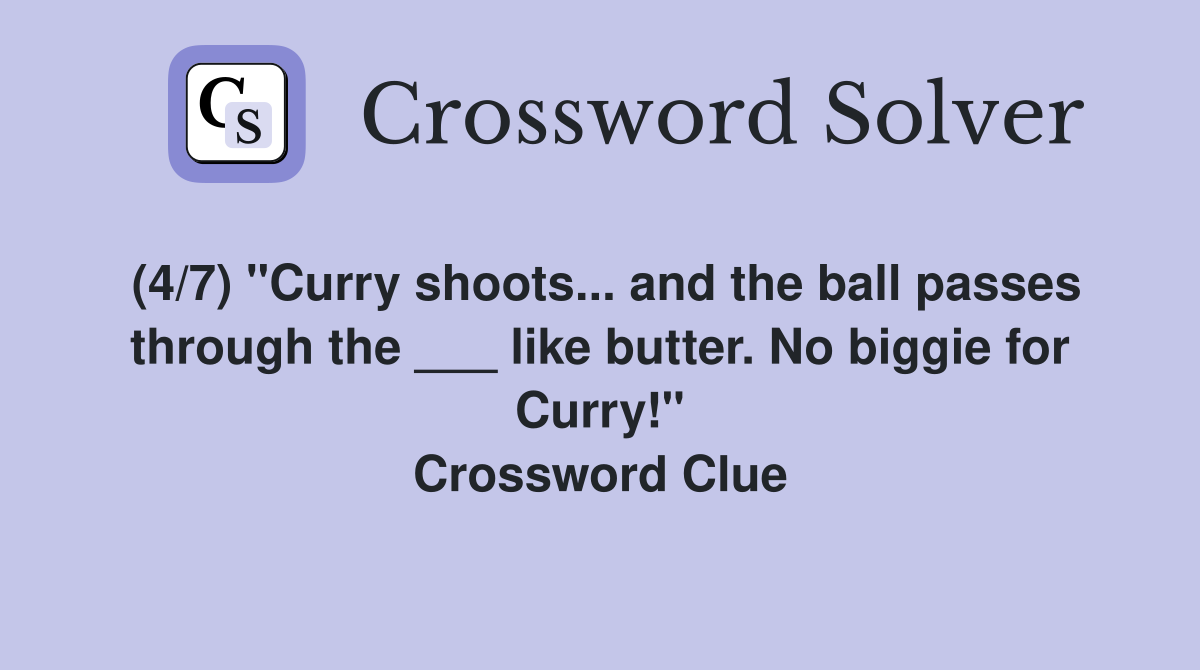 (4/7) "Curry shoots... and the ball passes through the ___ like butter Hot Indian Curry Crossword Clue Search for crossword clues found in the daily celebrity, ny times, daily mirror,. Answers for hot indian curry crossword clue, 8 letters. We have found 40 possible answers for this clue in. Hot indian curry crossword puzzle solutions. The croswodsolver.com system found 25 answers for hot indian curry crossword clue. We will try to find the right answer to this. Hot Indian Curry Crossword Clue.