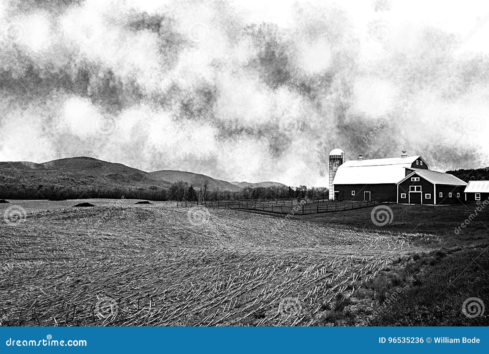Black and White Farm Landscape Stock Photo Image of large, barn 96535236