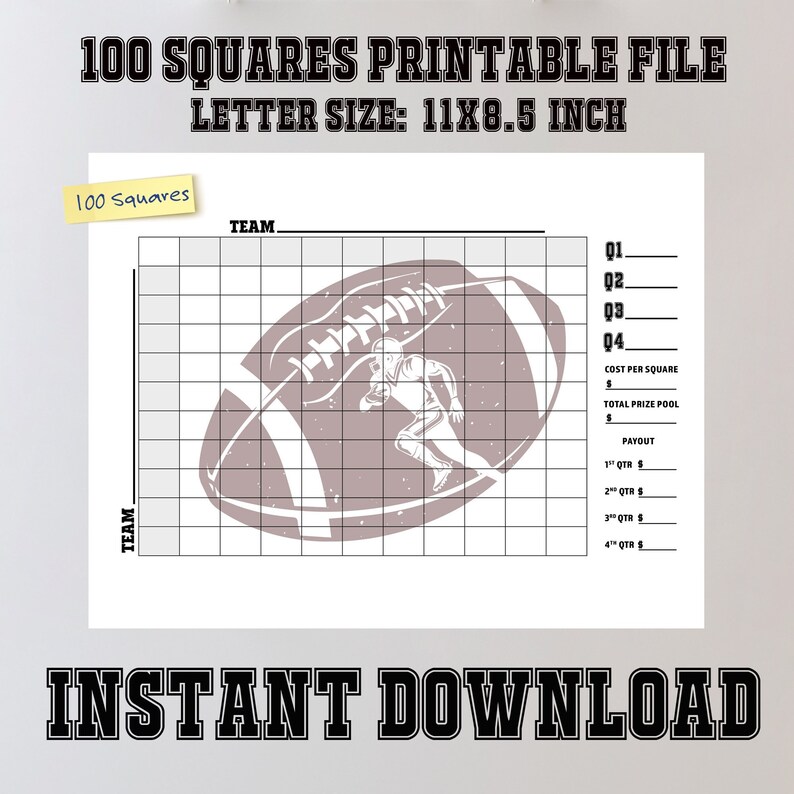 Printable Super Bowl Squares Classic 100, Squares Game, Instant Download, Super Bowl LVIII 2024