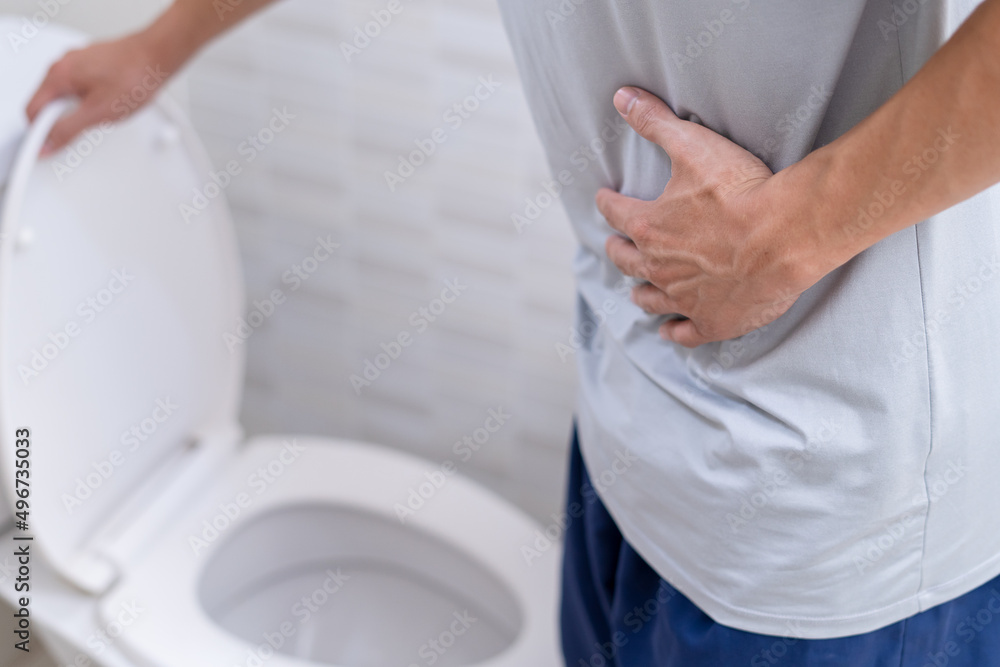 man standing has diarrhea and severely toxic food. Man touch belly in