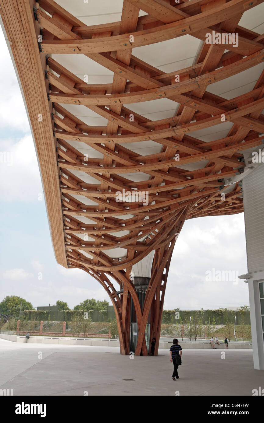 Detail showing the laminated timber columns and roof of the Centre