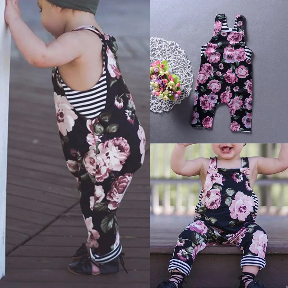 Puseky Baby Girl Overall Floral Striped Romper Suspender Sleeveless