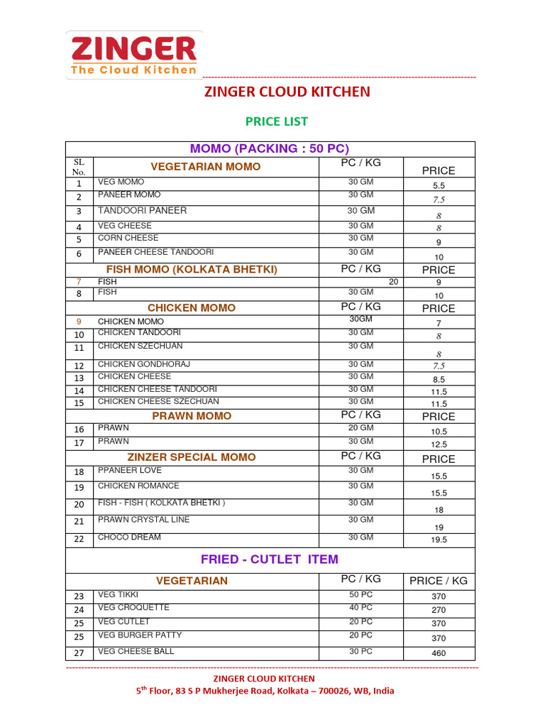 Zinger Price List PDF