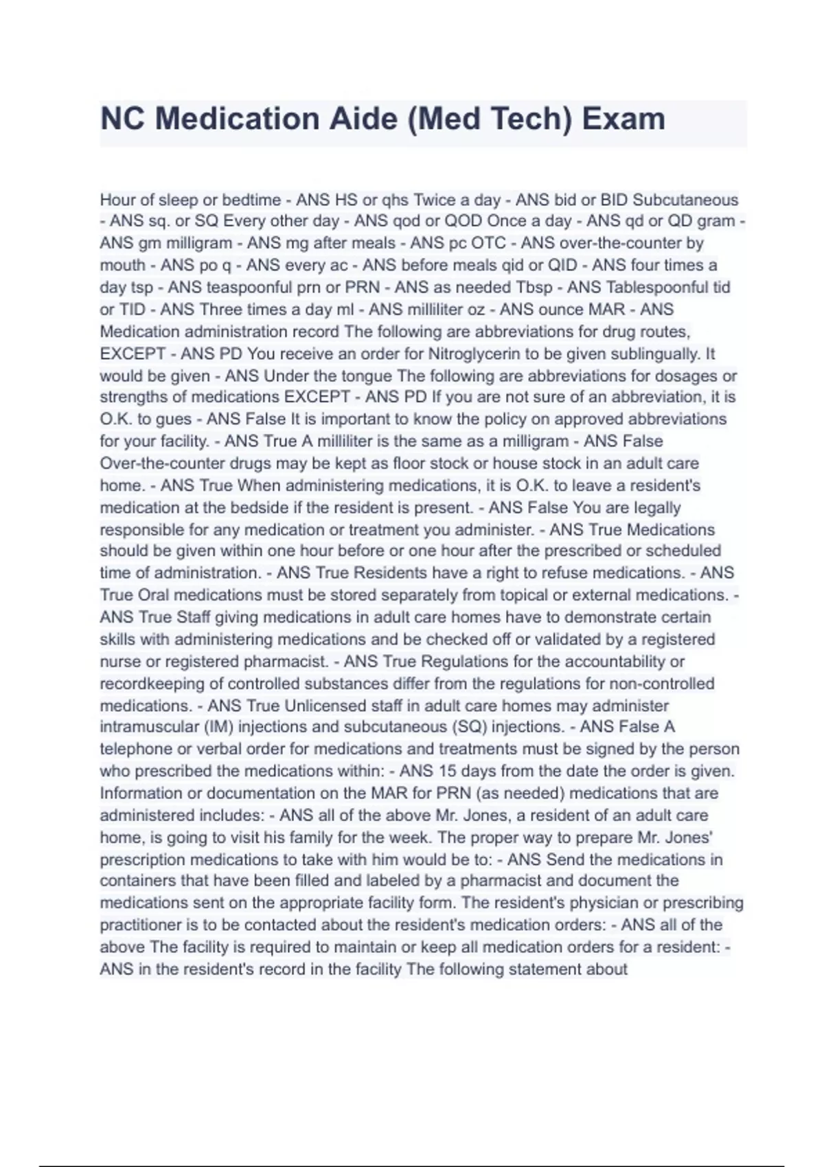 NC Medication Aide (Med Tech) Exam With Verified Correct Answers (A+ GRADED) 2022/2023 Med