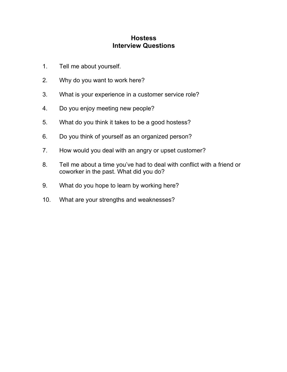 Sample Hostess Interview Questions Fill Out, Sign Online and Download Hostess Questions Explore 6 insightful interview questions from real hiring managers tailored for the host and hostess job role with sample answers. Learn about some of the commonly asked questions you may encounter during a restaurant host job interview, and use our. Find out about the various types of hostess interview questions you might expect when applying for this job, with some. Hostess Questions.