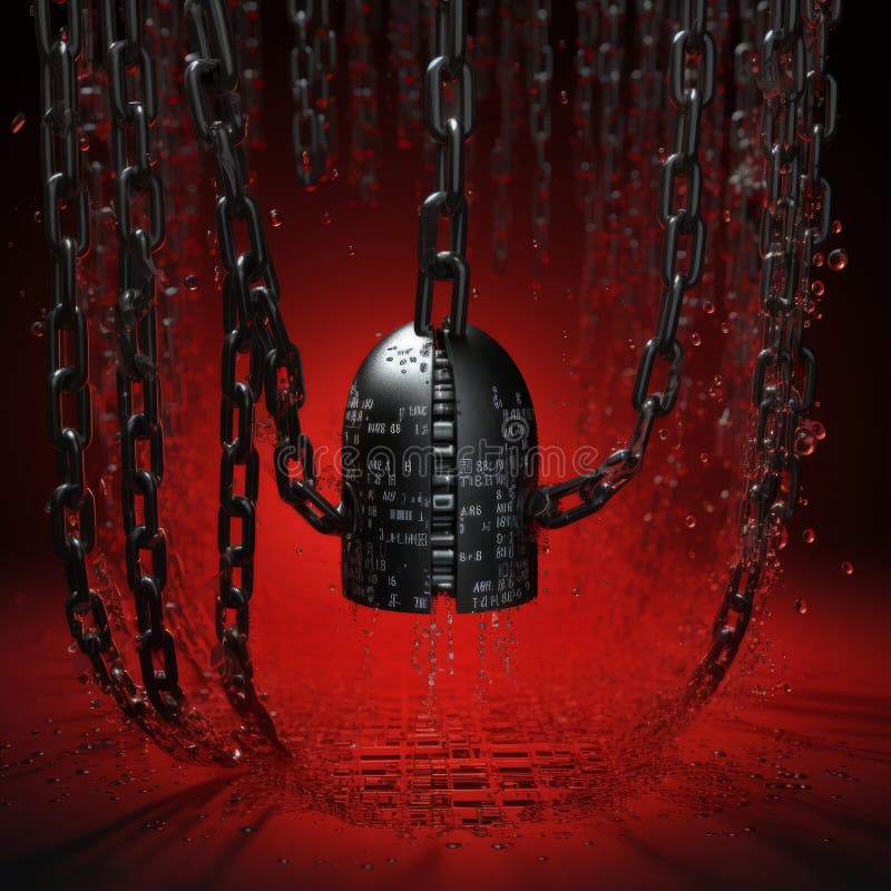 An Image of a Black and Red Lock with Chains Attached To it Stock