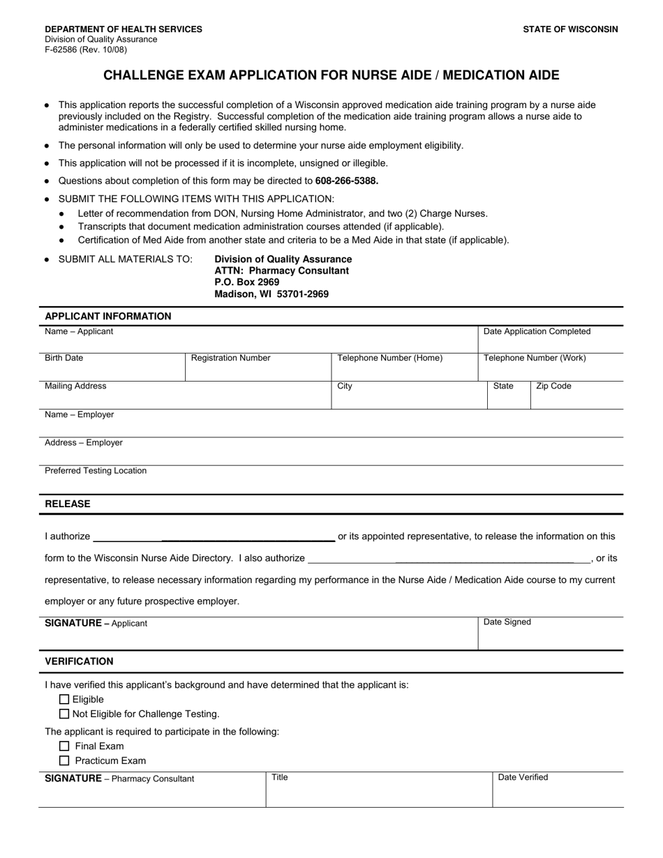 Form F62586 Download Fillable PDF or Fill Online Challenge Exam Medication Aide Wisconsin Currently registered wisconsin nurse aides interested in becoming a medication aide in a nursing home or hospice setting must meet basic eligibility requirements, have at least. The first way is going through a medication aid program. The second one is being exempted. The medication assistant program consists of classroom and laboratory instruction and supervised practice in a nursing home. Find. Medication Aide Wisconsin.