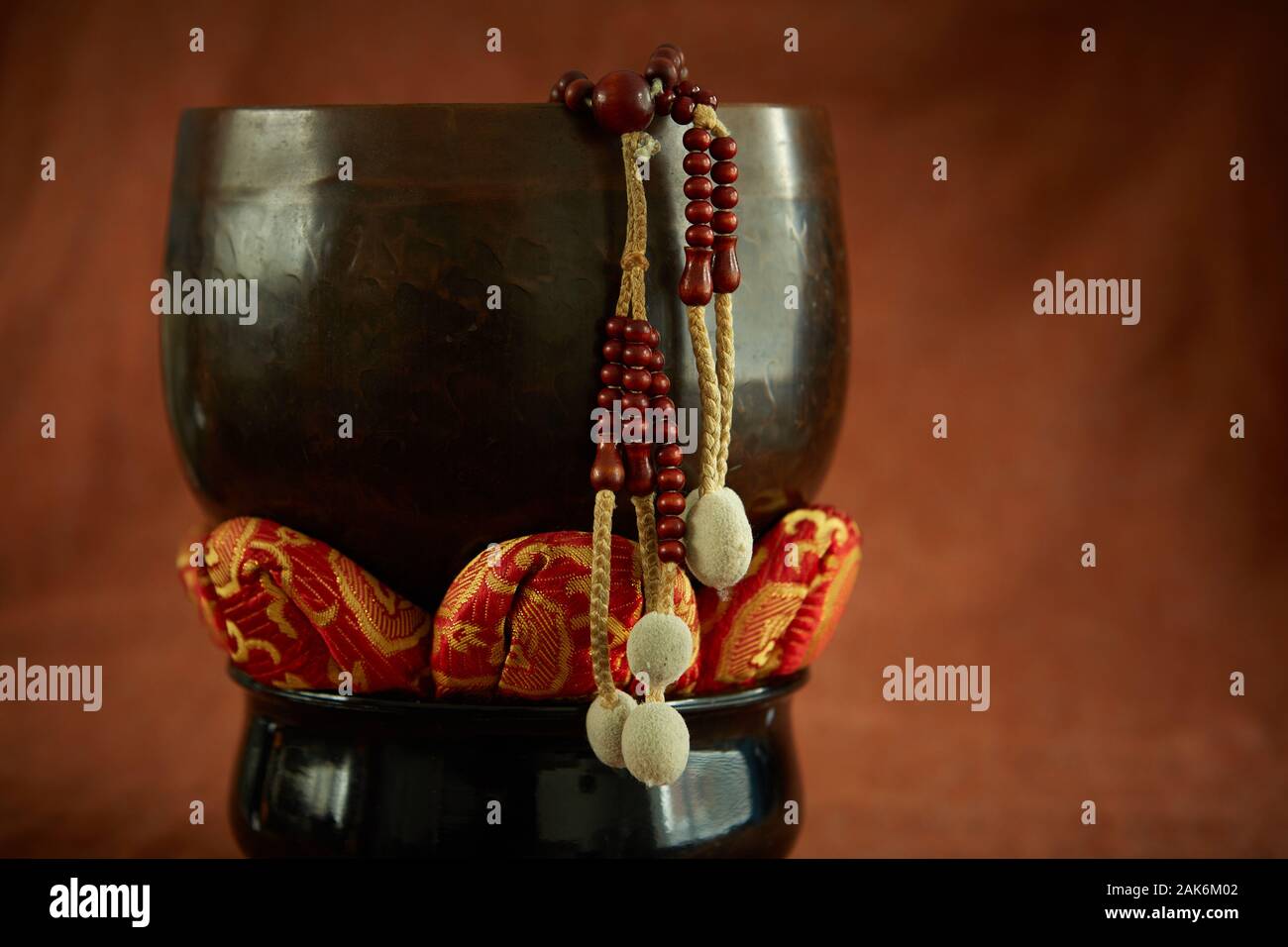 Buddhist Juzu prayer beads hanging over the side of a bell on Lotus