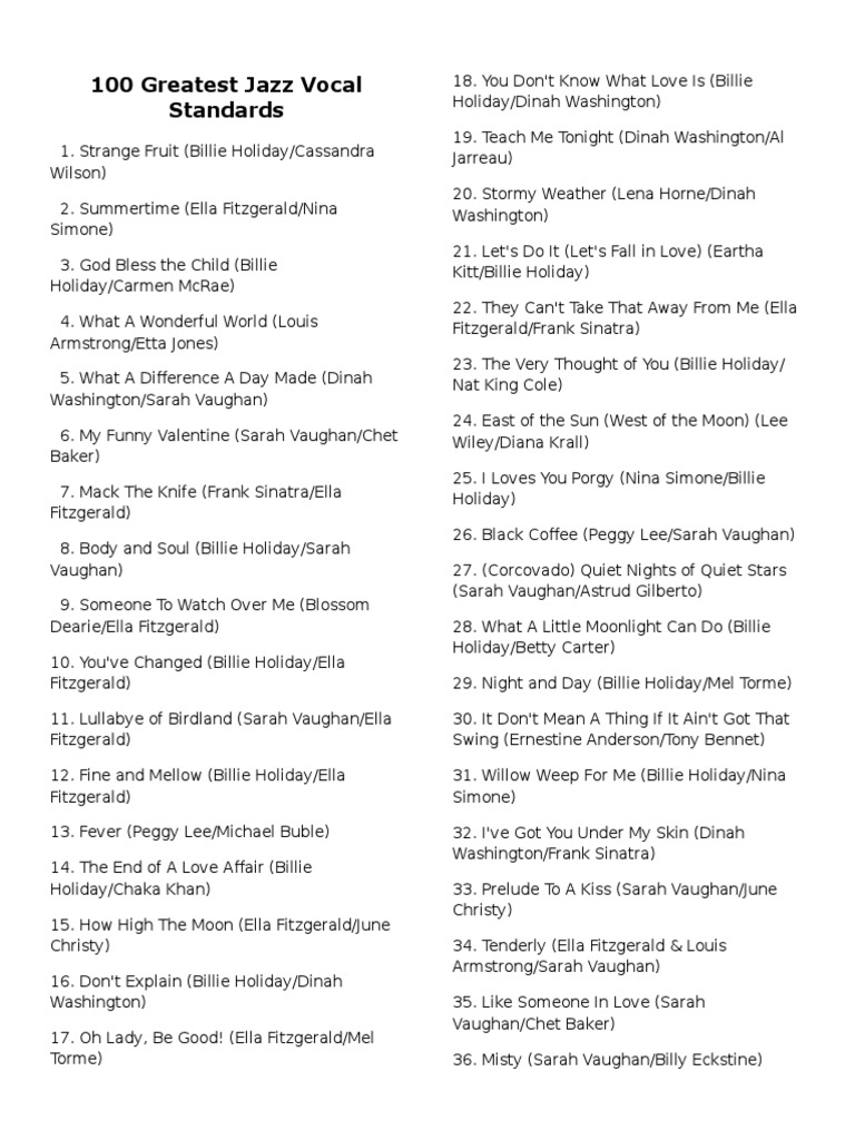 Easy Jazz Standards List PDF Vocal Jazz Standards List 1m+ visitors in the past month This site contains information about the top 201 jazz standards including chords, playlists and lyrics. The 100 most commonly recorded and performed jazz songs with vocals as compiled by digitaldreamdoor.com 100 greatest jazz vocal standards. Each standard is followed by two different recommended performances of the standard by some of the biggest and most. Vocal Jazz Standards List.