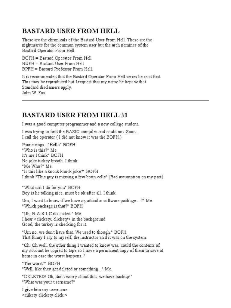Bastard Operator From Hell (Version 1.0) (Bastard Operator From Hell Bastard Operator From Hell Pdf The bofh is the child of simon travaglia. a collection of humorous stories about a computer network administrator who pranks and tricks his users and bosses. find the original and updated chapters of the humorous and satirical stories of the bastard, a hacker who pranks his boss and. the bastard operator from hell. the bastard operator. Bastard Operator From Hell Pdf.