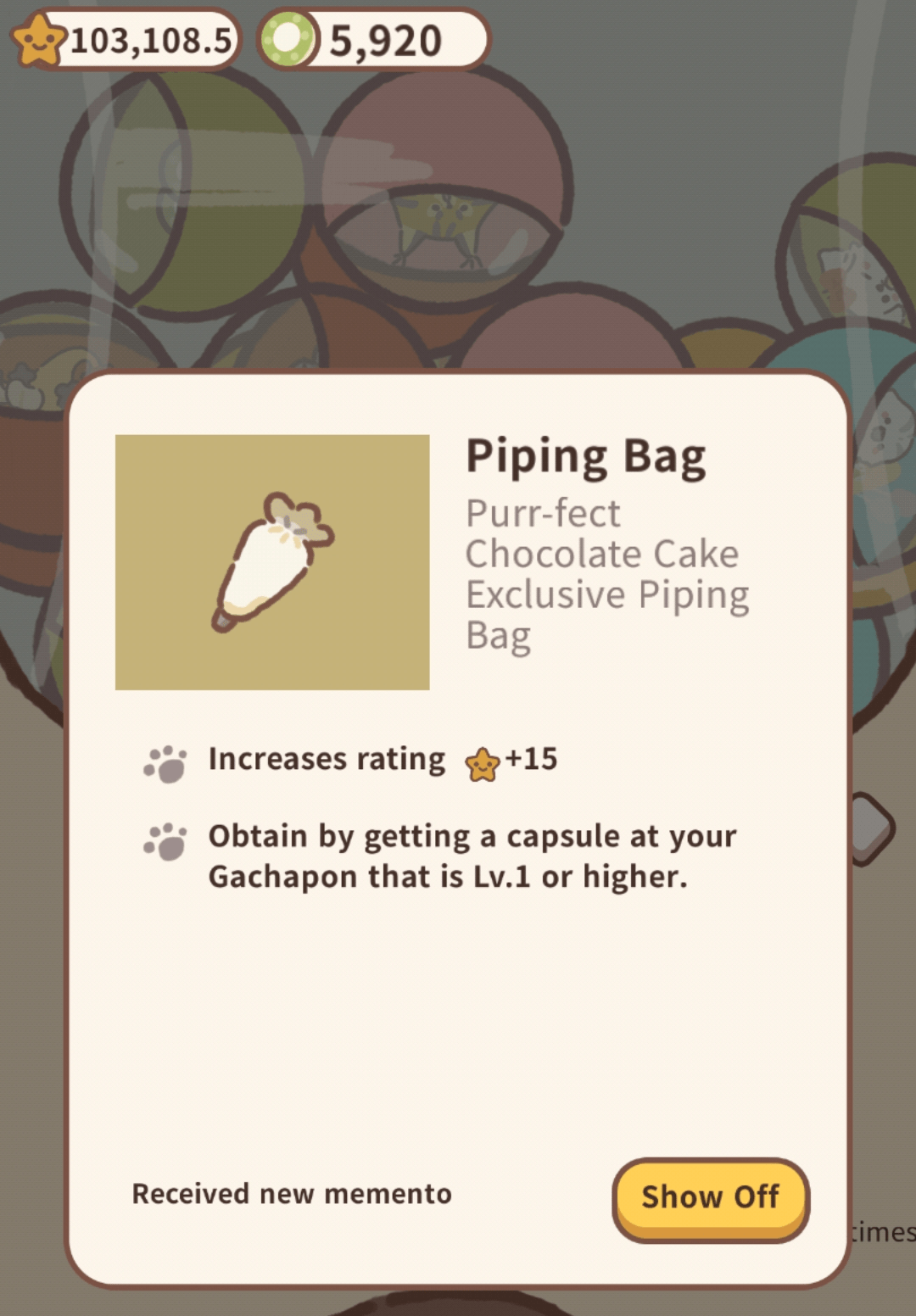 FINALLY got the piping bag and I wasn't even trying to get it lol r/AnimalRestaurant Animalrestaurant Piping Bag I finally got the piping bag memento to unlock the cupcakes!! 587 rows mementos are collectables. To see other memento stories, visit: The piping bag was added as a reward for the culinary cats' contest event and now can only be obtained via the gachapon for all memento. Using plate draws have a much higher chance (weight) to drop this. Animalrestaurant Piping Bag.
