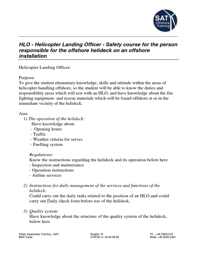 HLO Helicopter Landing Officer SAT ApS Safety Awareness Training Helicopter Landing Officer Requirements The helicopter landing officer must have completed a training course, approved by the national aviation authority. Understand the key roles and responsibilities of a helicopter landing officer in offshore and onshore operations. This training is designed to equip delegates with initial knowledge, to understand the skills required to perform the roles of an offshore helicopter landing officer safely and effectively.. Helicopter Landing Officer Requirements.