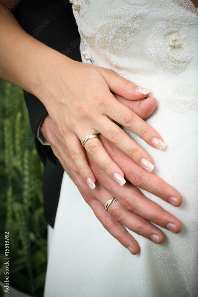 Wedding hands with rings on pregnant bride StockFoto Adobe Stock