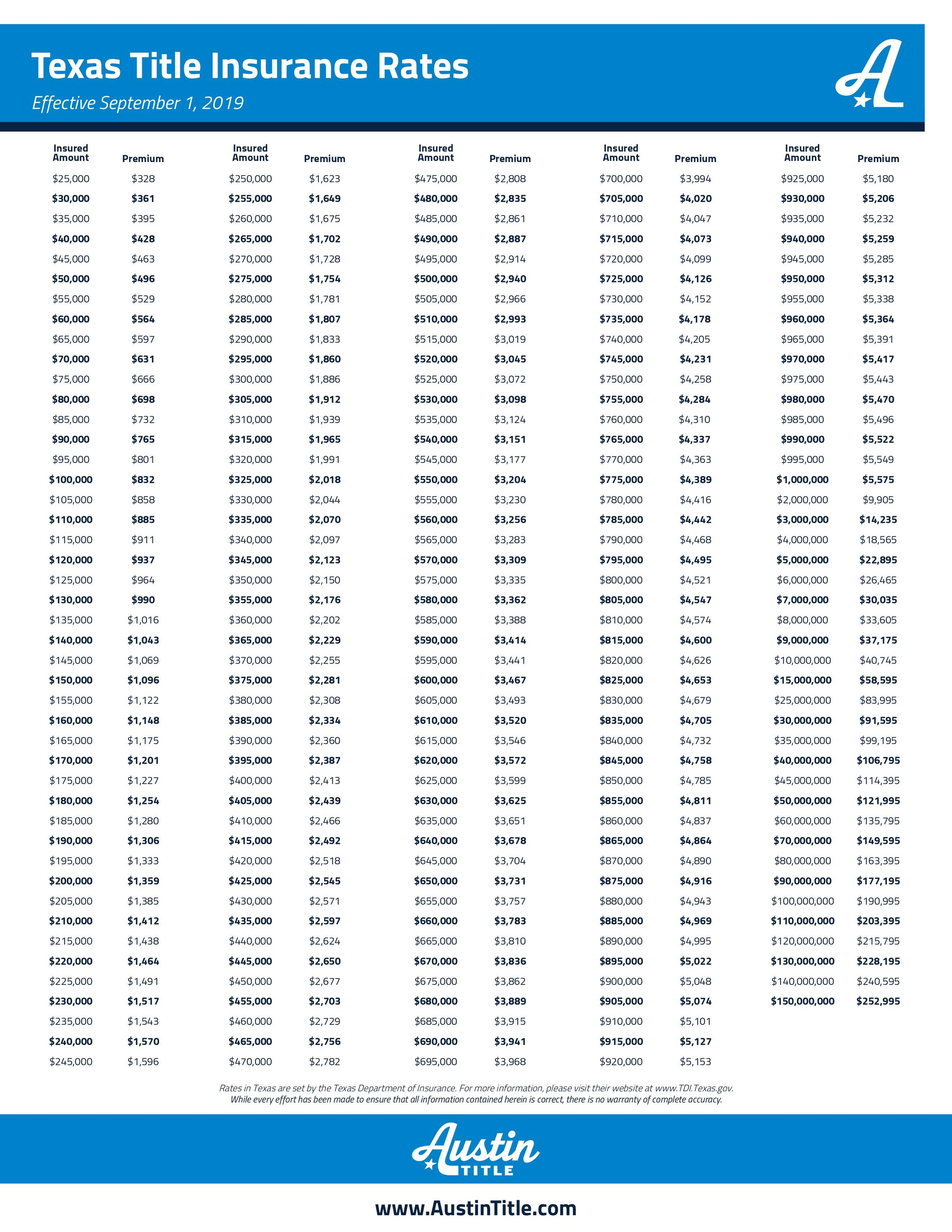 Rates are based on the property’s sale value. Title insurance rates in texas are regulated. The following title insurance premium rates for the owner’s title policy are based on the sales price of the property and are set by the texas. Find a real estate agent. First american’s title fee calculator provides a comprehensive. All title companies will charge the same premium for a policy. 39 rows rates effective september 1, 2019. Get a quick estimate of title rates and settlement fees for your next transaction. Title rate chart in pdf. 47 rows using the table below, apply these steps to determine basic premium for policies above $100,000: