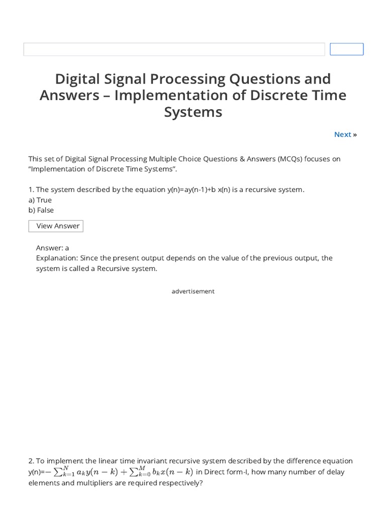 Digital Signal Processing Questions and Answers Implementation of Discrete Time Systems PDF