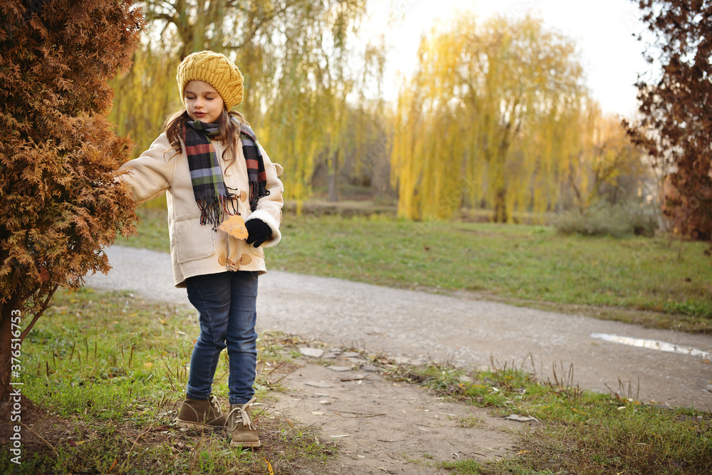 Cheerful preschooler little girl in coat and yellow hat with autumn