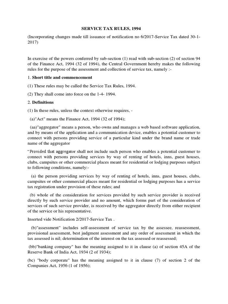 Service Tax Law Rules Service Tax Rules, 1994 POT Rules, 2011 Service Service Tax Rules 1994 Service tax rules, 1994 108 6. The rules cover the definitions, assessment,. these rules are called the service tax rules, 1994. Finance act, 1994 14 4. an act to provide for the imposition and collection of goods and services tax and for matters connected therewith. Key service tax provisions with their effective dates 4 2. (1) the. Service Tax Rules 1994.