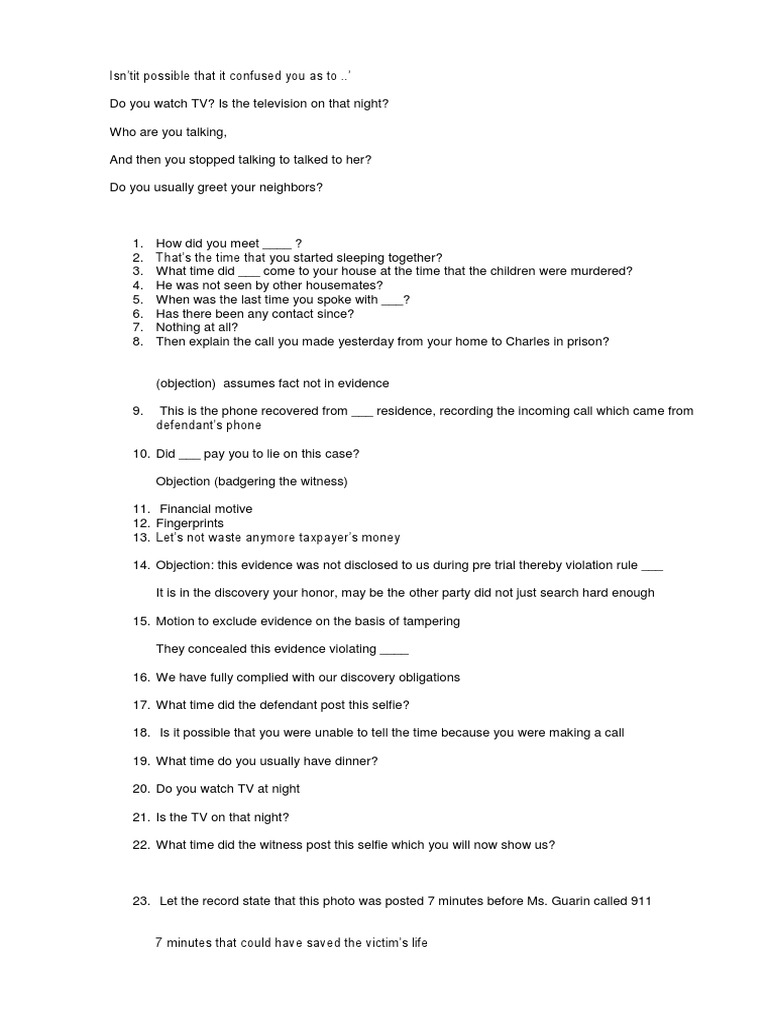 Cross Examination Questions FOR ADEL CROSS EXAMINATION QUESTIONS FOR Cross Exam Question Examples The prosecutor may ask questions to imply that. This is an excerpt from a larger cross that occurred during a motion to suppress evidence. cross examination is a technique used in legal settings to question a witness who has already given testimony during direct examination. a sample cross examination. Cross Exam Question Examples.