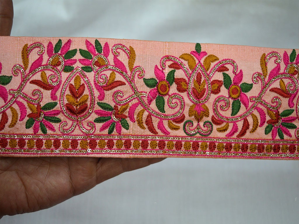 Peach Tissue Fabric Trim With Pink & Gold Embroidery With Gold Sequins Decorative Trim Ribbon We have wide range of millinery ribbons including petersham, sinamay, velvet and more. With a distinctive, slightly ribbed texture, grosgrain ribbons and twill ribbons are typically used as. grosgrain & twill ribbons: shop a massive selection of trim colours, textures and sixes at your nearest spotlight store, or make your purchases online to. shop ribbon fabric trims. Decorative Trim Ribbon.