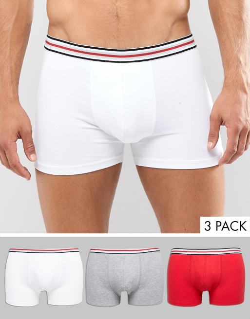 ASOS DESIGN trunks in red white & gray with striped waistband 3 pack in