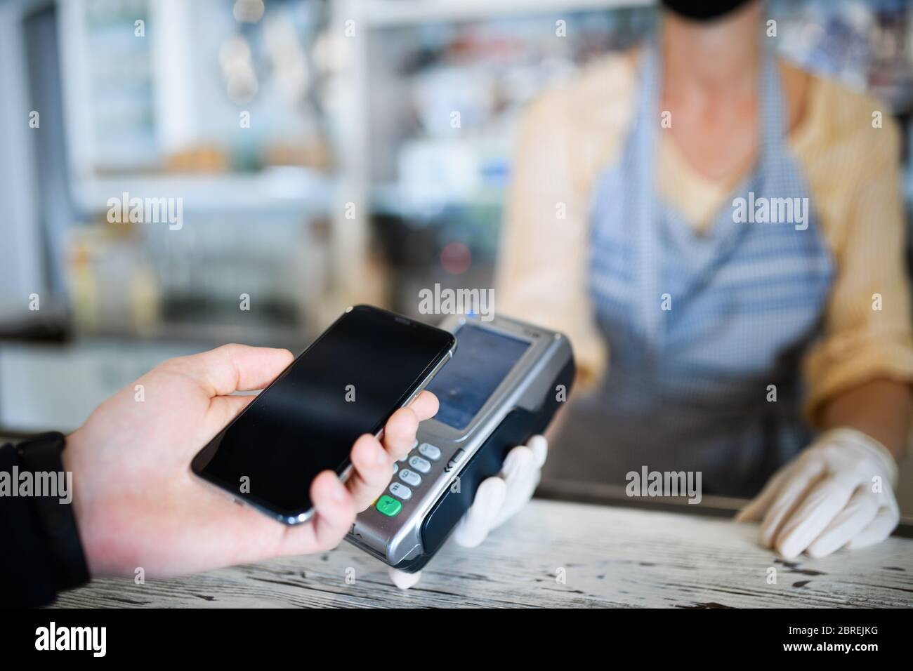 Contactless payment with smartphone, coffee shop open after lockdown