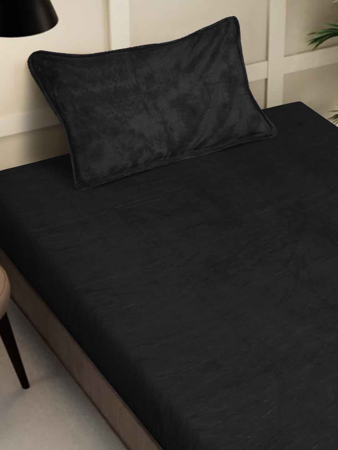 Klotthe Black Solid Woolen Fitted Single Bed Sheet with Pillow Cover