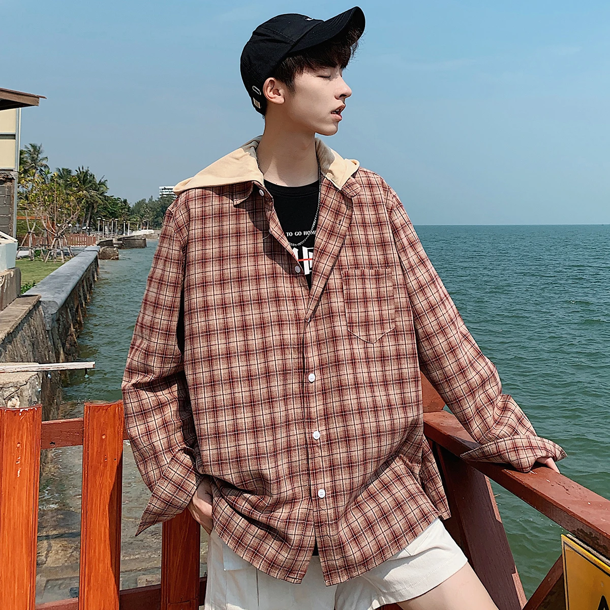 2019 Spring New Men's Cotton Clothes Hat Lattice Printing Coats Long