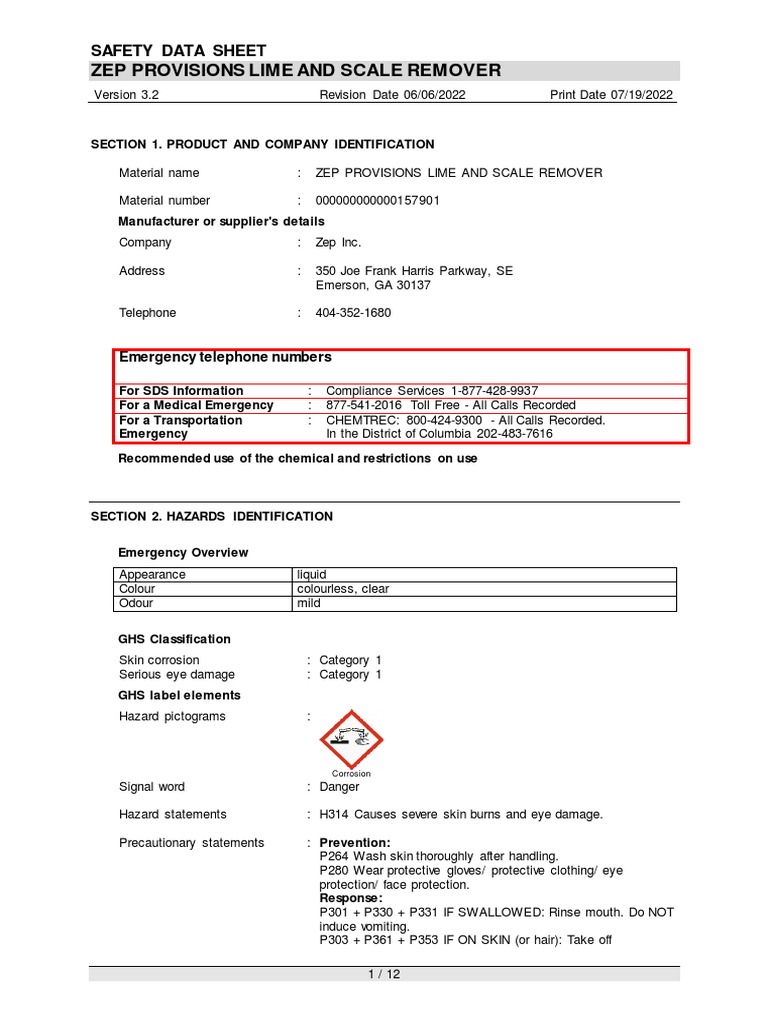 Zep Provisions Lime and Scale Remover Safety Data Sheet PDF