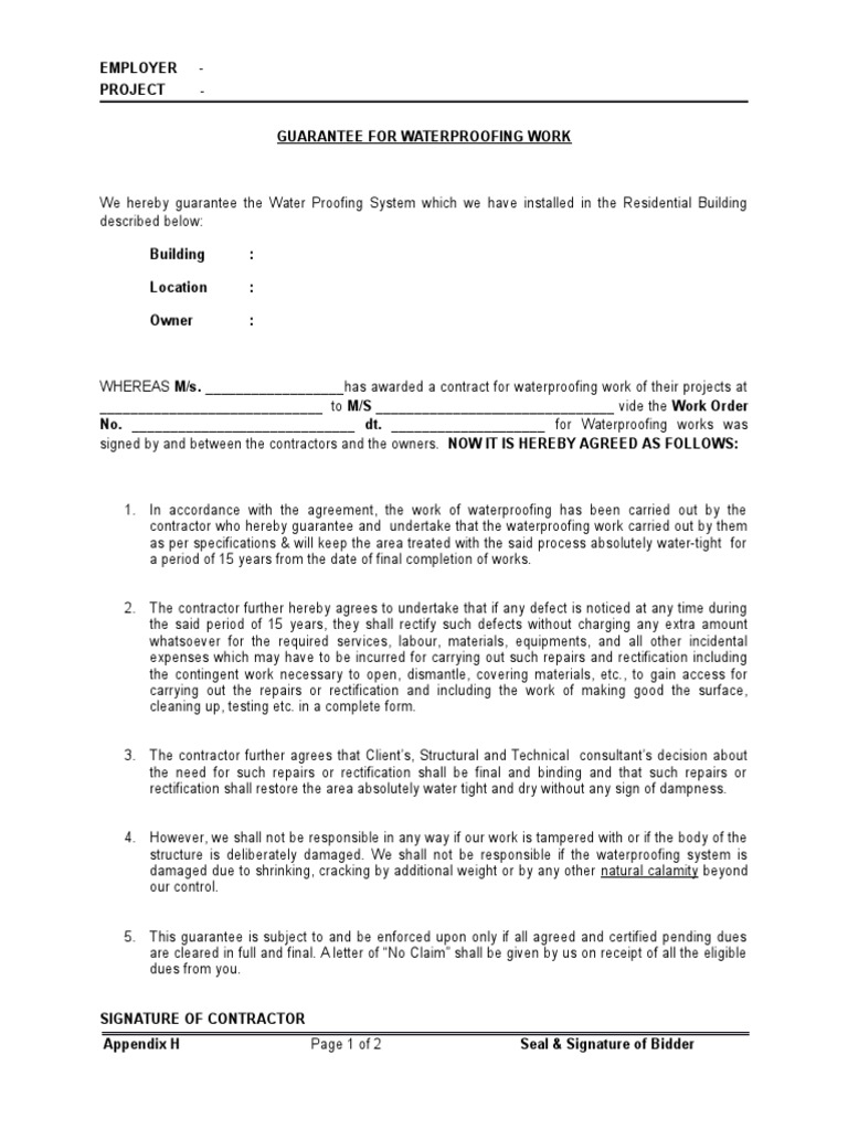 Waterproofing Guarantee Format Guarantee Private Law