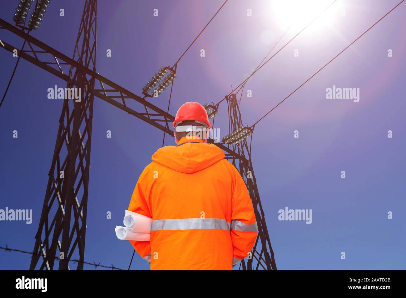 Electrical engineer looking at substation, back view Stock Photo Alamy