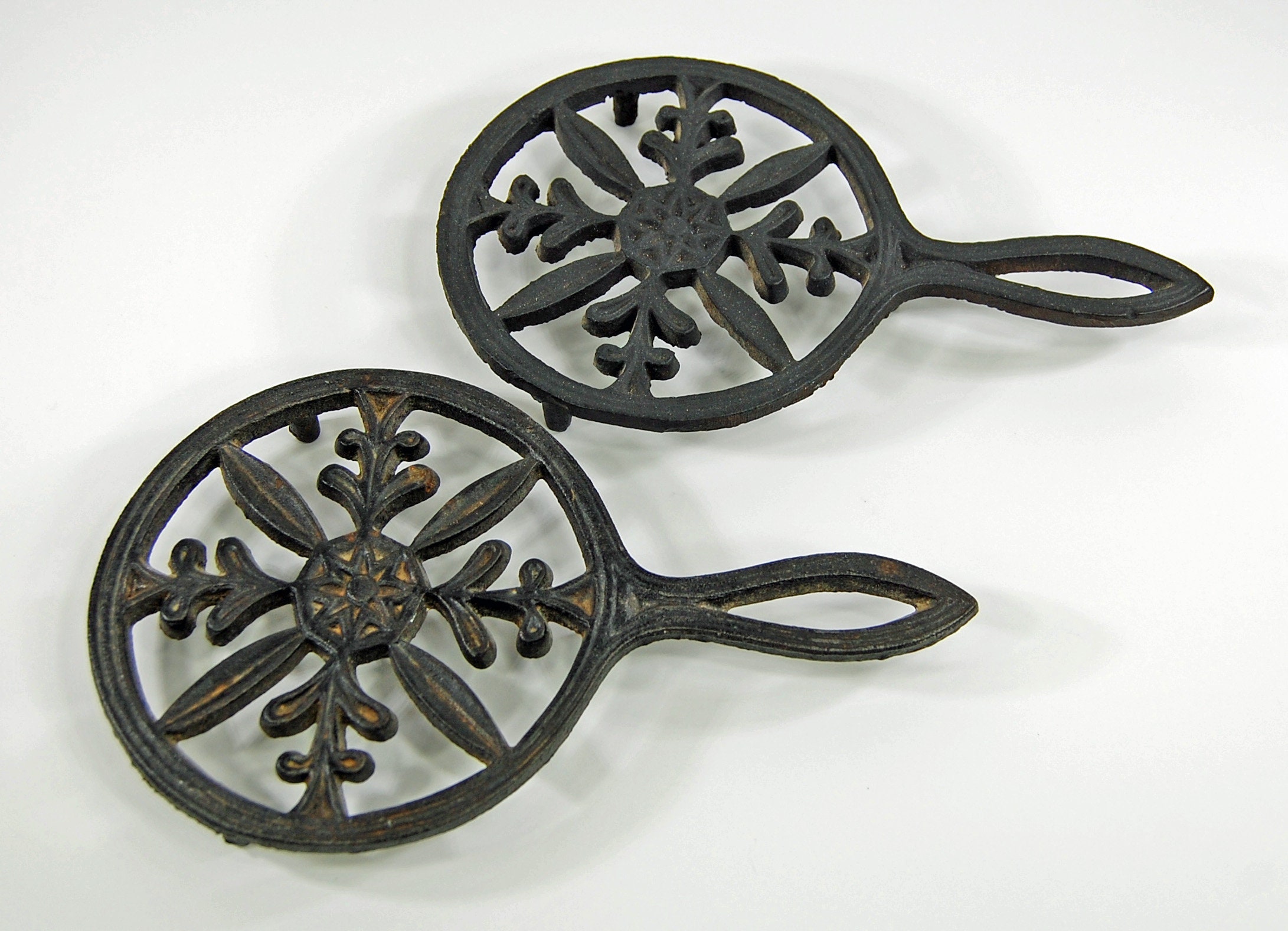 Two Antique Cast Iron Trivets by MagyarBeader on Etsy Trivets Cast Iron Browse a large selection of trivets in a wide range of sizes, finishes and styles. non slip black cast iron stove trivets for kitchen wok support ring cooktop range. trivets are tabletop accessories to keep hot pots and vessels and protect the tables and mats from heat transfer. shop online for cast iron trivets. Round signature trivet. Trivets Cast Iron.