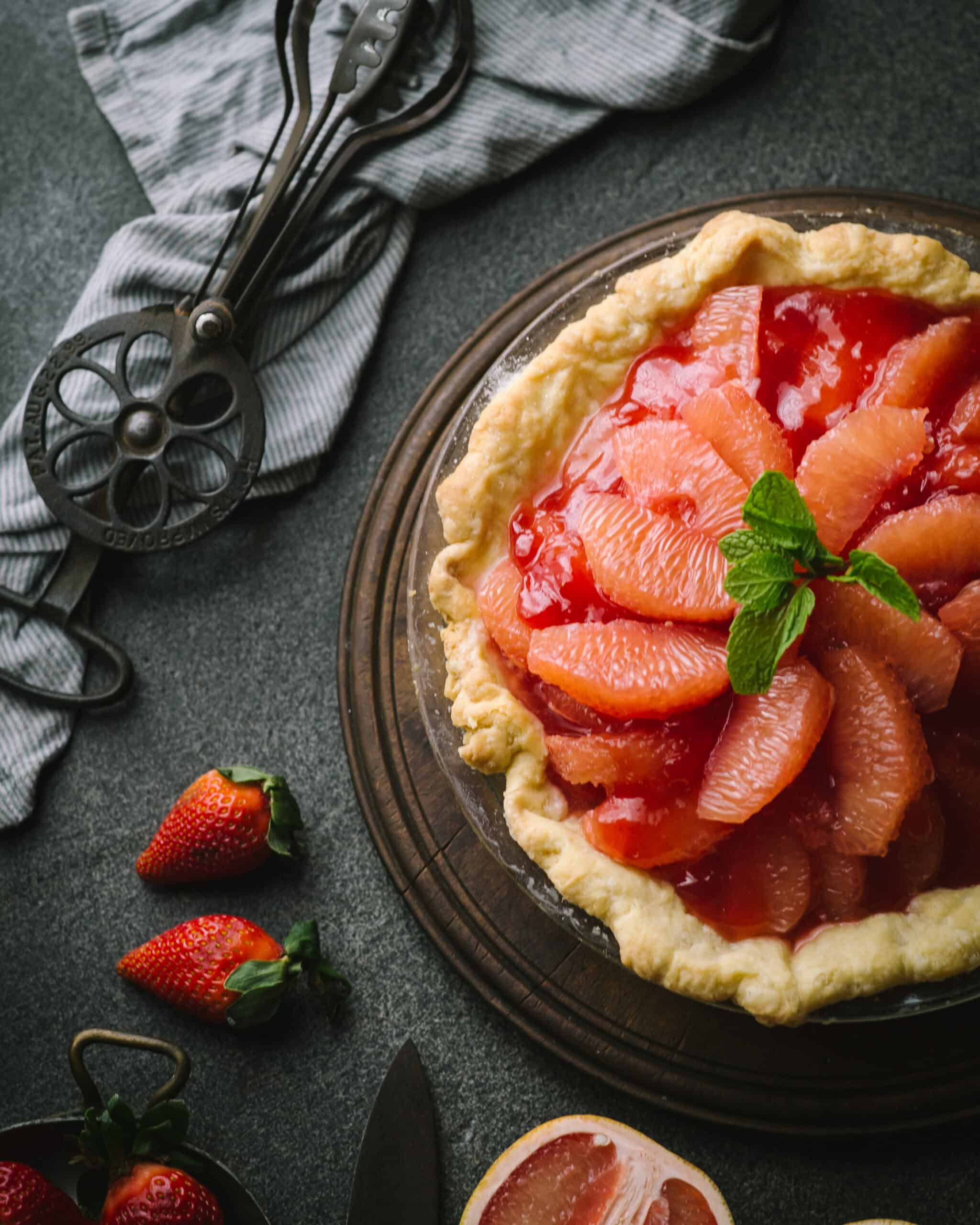 Grapefruit Pie  Learn how to make a sweet and tangy pink grapefruit pie with graham cracker crust, sour cream, and citric acid. This pie is a twist on key lime pie and a perfect dessert for grapefruit lovers. Learn how to make a juicy and delectable grapefruit pie with fresh strawberries and homemade glaze. Learn how to make a refreshing and creamy. Grapefruit Pie.