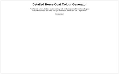 Horse Colour Generator - Feeling curious about what color your next horse might be? Generate random horse colors with perchance's horse color generator. With the horse color calculator, you can easily input the color genetics of the parent. A bay or brown test for these colours a bay or brown test for these colours select your parent genes reset sire dam Learn about the.