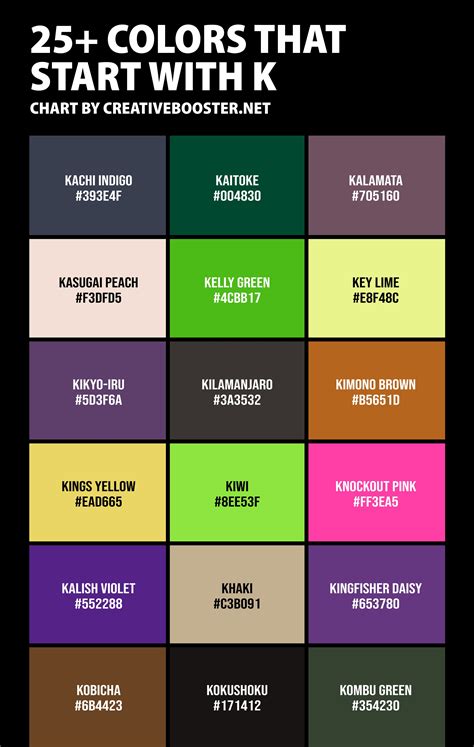 Colour That Start With K - List of colors beginning with the letter k, including hex color code details, description,. From the regal richness of kingly purples to the earthy embrace of khaki greens, each hue holds a universe of meaning and design potential. From the warm earthiness of khaki to the freshness of kiwi green to the color boom of kaleidoscope, more than 40 shades.