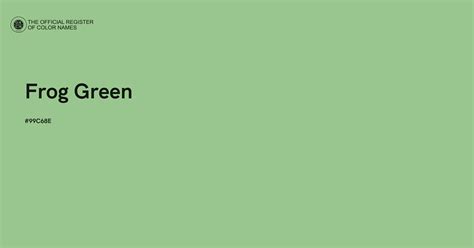 Frog green is a warm color. View the detailed color specifications of frog green, including hex, rgb, cmyk, hsv, hsb, pantone and ral codes. 112 rows information on the #99c68e or frog green html color code with its rgb and hsl make up, lighter and darker colors, analogous colors, and trinary colors.