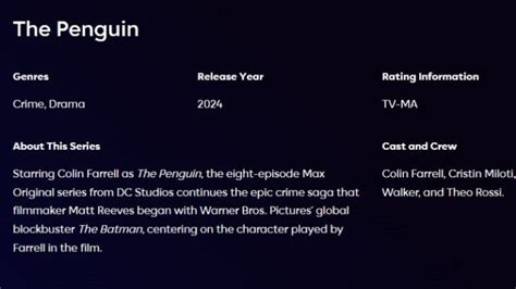 The penguin is a u.s. According to hbo, the spinoff series, starring colin farrell and cristin milioti, drew 5.3 million viewers in the u.s. The penguin is rated 16 with warnings for offensive language, violence, sexual themes. Per hbo, the spinoff series starring colin farrell and cristin milioti opened to 5.3 million u.s.
