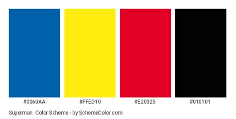 Superman Color Theme . Find color inspiration for your design. The superman color scheme has 4 colors, which are medium persian blue (#0060aa), canary yellow (#ffed10), cadmium red (#e20025) and black (#010101).