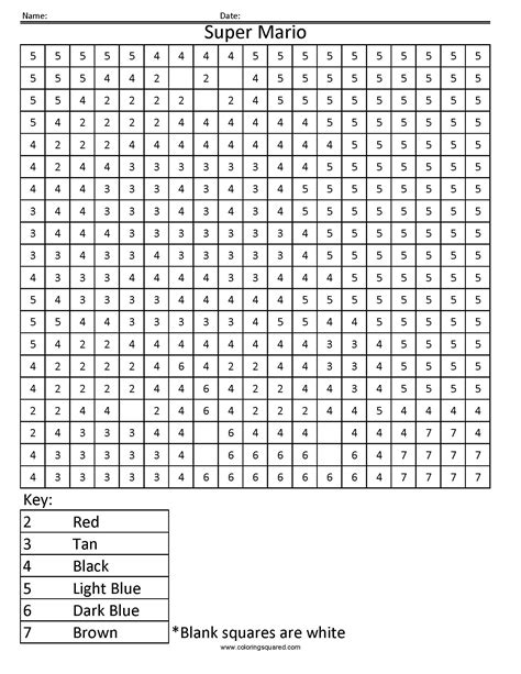 Coloring Squared Super Mario - Use basic counting skills and the key at the bottom of the page to create a fun nintendo super mario color by number picture. Super mario color by number: Date:*blank squares are white www.coloringsquared.com These free super mario pixel color by number printables are just the ticket! Click on the correct color in the color key below the grid.