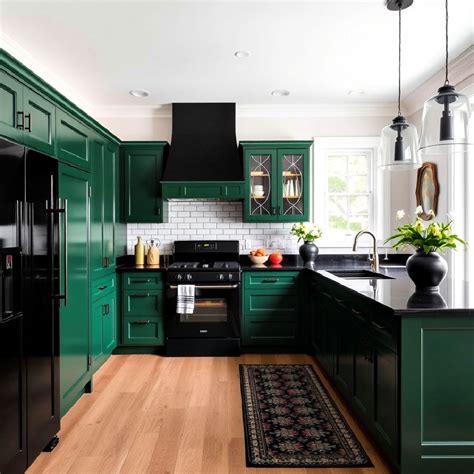 Dark Emerald Green Kitchen - Explore our tips on using green paint, cabinetry, and decor to create a space. The rich green cabinetry pairs beautifully with rustic brick accents, creating a cozy yet modern vibe. Incorporating dark moody accents with emerald green can transform your kitchen into a cozy retreat. Discover dark green kitchen ideas from forest green to emerald to create a relaxing feel.