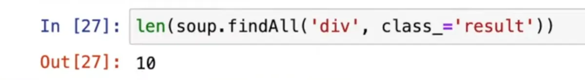 По карточкам можно пройтись как с помощью Beautifulsoup, так и с помощью Selenium. Сначала сделаем так, как уже делали в прошлом уроке. Введем команду findAll, чтобы найти все нужные div-ы с классом result. Проверим с помощью len, сколько их на странице. Должно получиться 10.