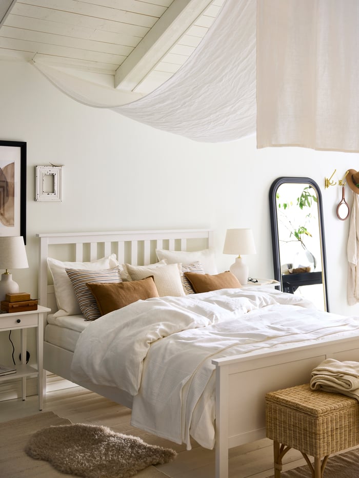 Hazel and Hen For an all-in-one frame, consider an upholstered bed fit for royalty like the IKEA Tufjord bed. Designer Hazel and Hen took it a step further by upgrading the frame with IKEA Brynilen legs in this bright, inviting bedroom. Plenty of warm wood accents paired with white décor and modern touches give this space a dreamy Swedish style.