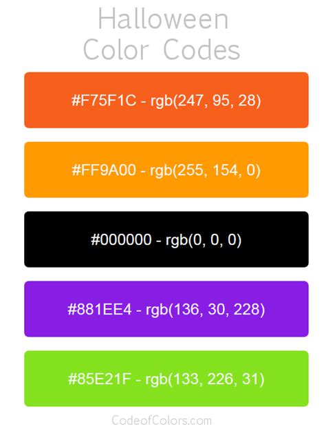 Halloween Color Palette Hex and RGB Color Codes Halloween Color Code Html A curated collection of great color palettes for designers and artists. Web the happy halloween color scheme palette has 6 colors which are eerie black (#1c1c1c), princeton orange (#f4831b), dark orchid (#902ebb), ryb green. Below is a color palette that can be used in digital designs for halloween. Web discover the perfect halloween color palette! In each colored box you. Halloween Color Code Html.