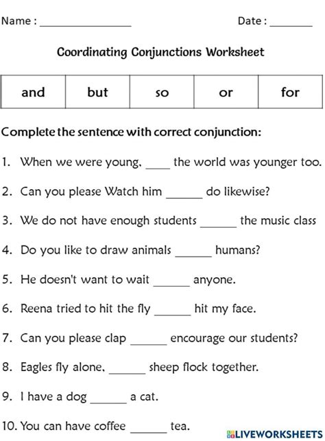 Coordinating Conjunction Worksheets Conjunction Worksheets For Grade 4 Web practice forming compound sentences with coordinating conjunctions (and, but, or, so, yet, for, nor) in grade 4 grammar. Explore rules, examples, and engaging worksheets to enhance your understanding of how conjunctions bring words and ideas together in english. Master the art of sentence connection with our class 4 conjunctions guide! Combine two sentences by using a comma and a.. Conjunction Worksheets For Grade 4.