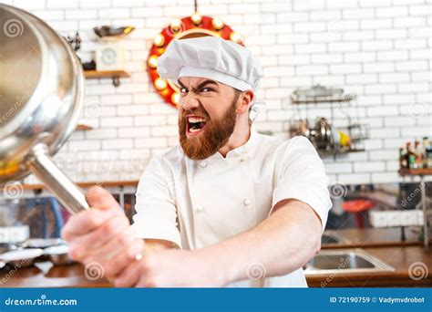 Crazy Housewife Raising Frying Pan Threatening And Screaming, Yellow from www.alamy.com