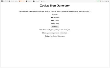 Zodiac Sign Generator . Our random zodiac sign generator is a useful tool for anyone who needs to generate a zodiac sign for a variety of purposes, such as for filling a survey or generating zodiac signs for fictional characters in a play or a story. People of any star sign can probably work out how to use this tool.