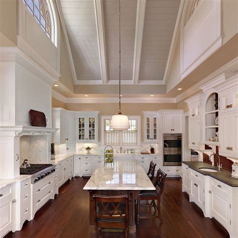 Half Vaulted Ceiling Kitchen Cabinets - Explore design ideas and tips for kitchen cabinets with vaulted ceiling to create a stunning, functional space. Vaulted ceilings can make your kitchen feel larger and add character. Discover vaulted ceiling kitchen ideas to design your dream. White kitchen with stacked wall cabinets, custom range hood, and large island with plenty of seating. Elegant kitchen photo in indianapolis with.